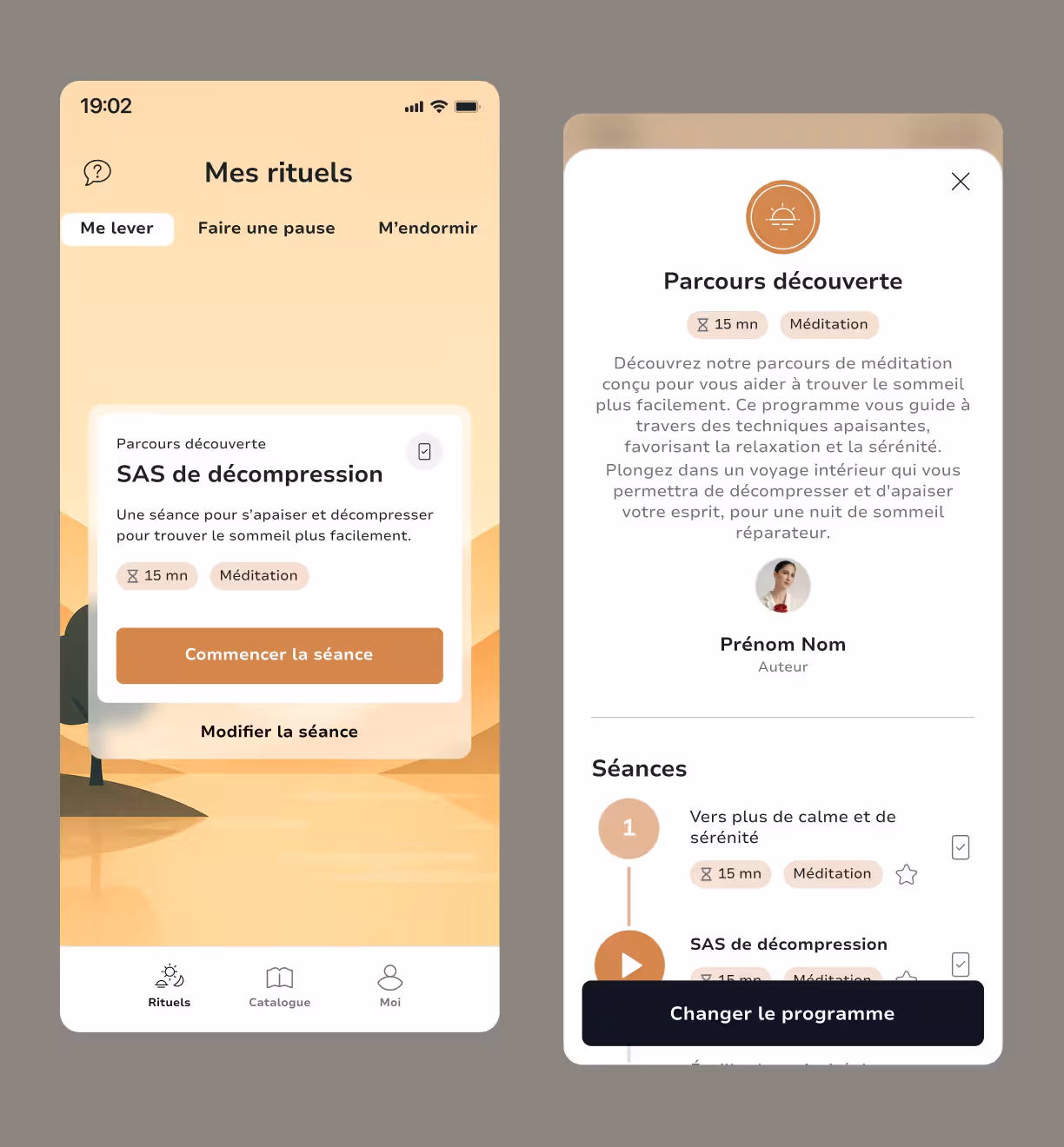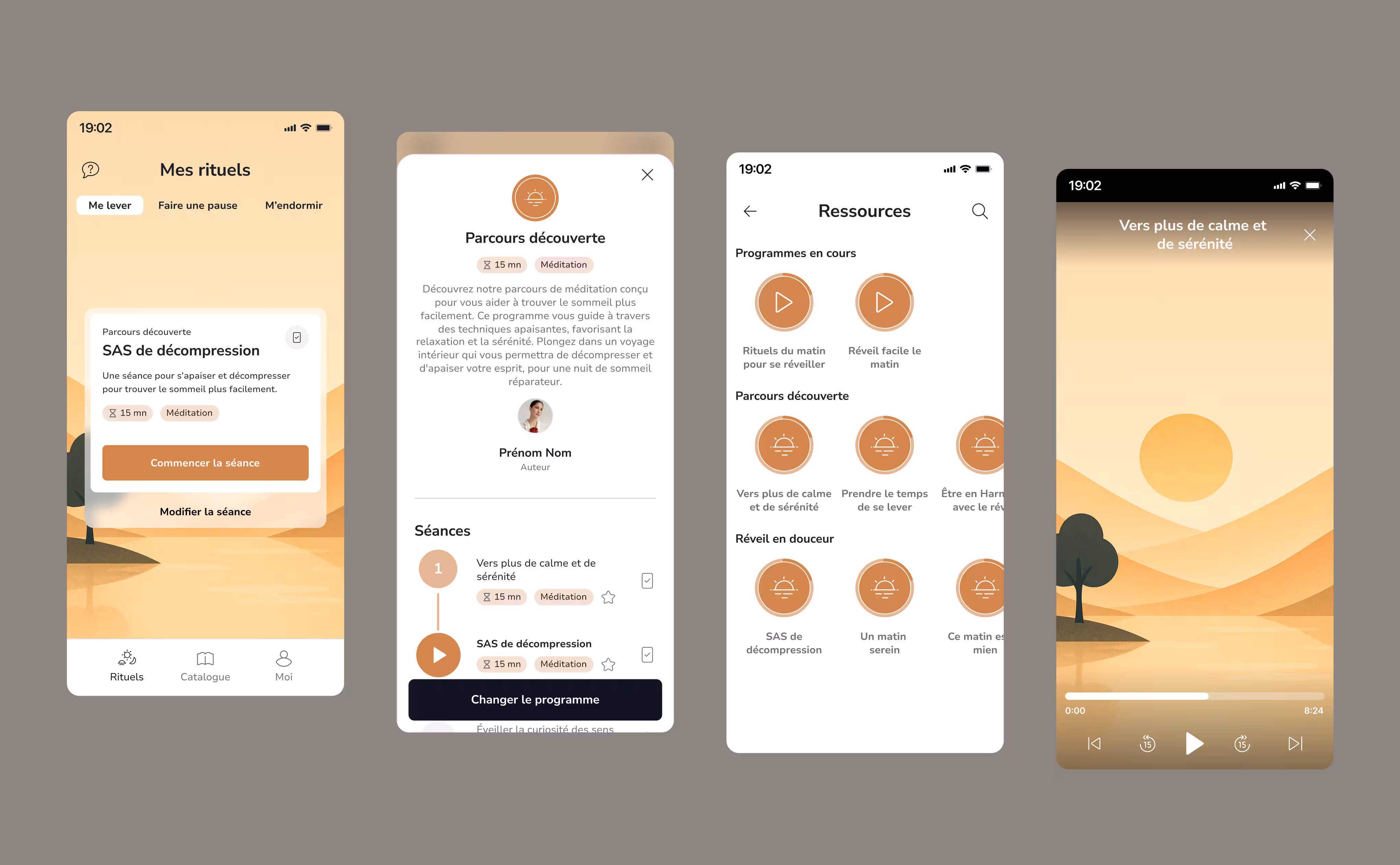 Nous avons conçu une expérience mobile complète autour du sommeil, en respectant l’univers visuel, les codes graphiques et la philosophie de Petit Bambou. L’application a été pensée pour accompagner l’utilisateur tout au long de la journée grâce à des rituels ciblés : réveil en douceur le matin, pauses de régulation l’après-midi et préparation au sommeil le soir. Les parcours UX/UI ont été imaginés pour favoriser l’apaisement, la régularité et l’engagement, avec une navigation fluide, des contenus contextualisés et une progression naturelle. Un projet centré sur le bien-être, visant à améliorer durablement la qualité du sommeil et à installer des habitudes positives au quotidien.